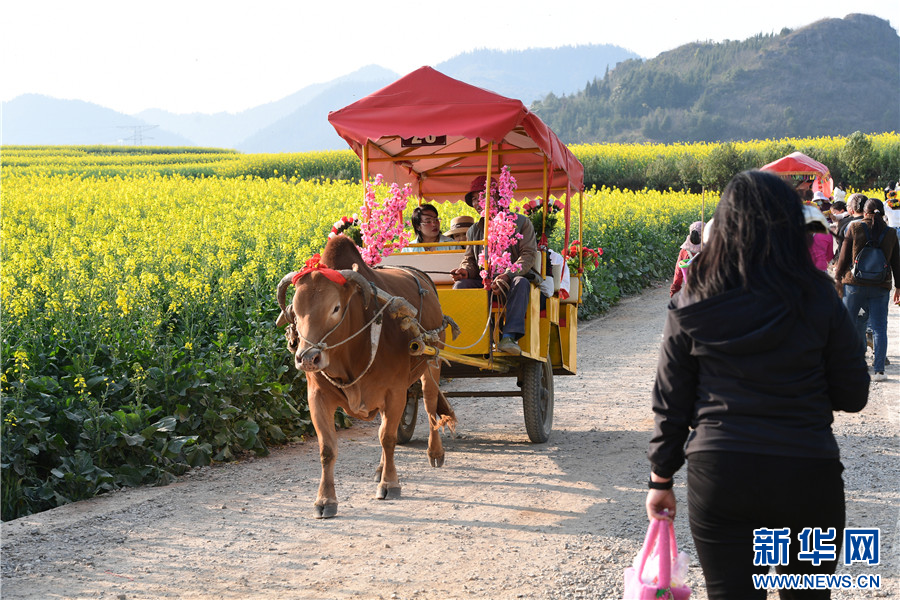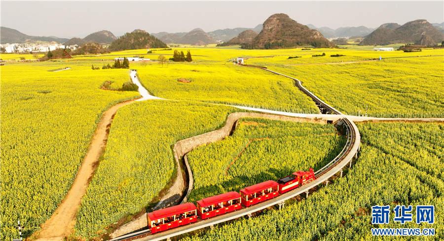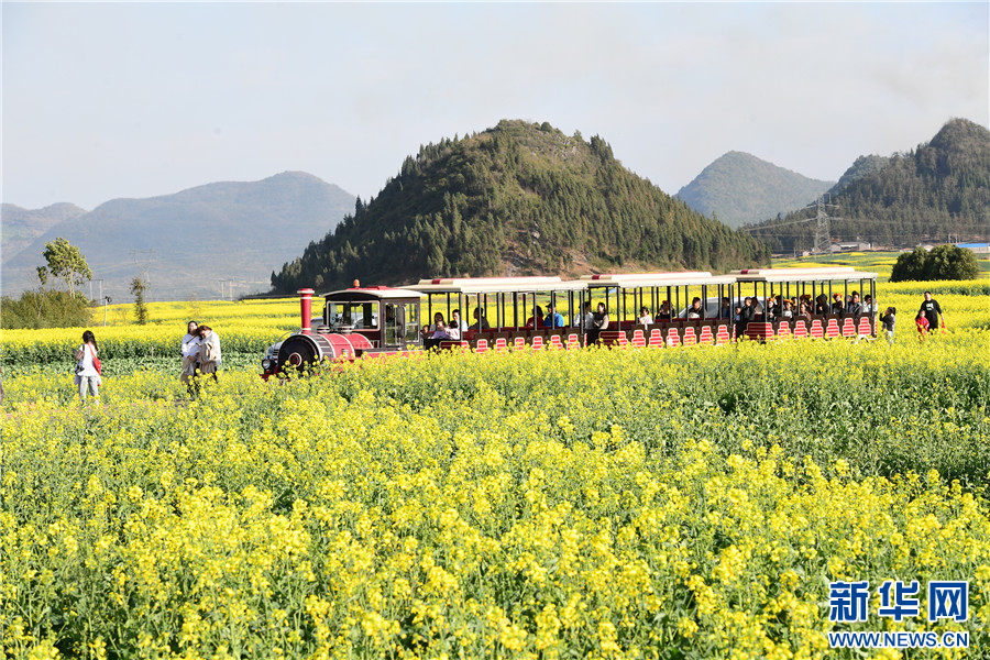 游人在云南省羅平縣乘坐小火車穿越油菜花海(2月20日攝)。新華網發(毛虹 攝)