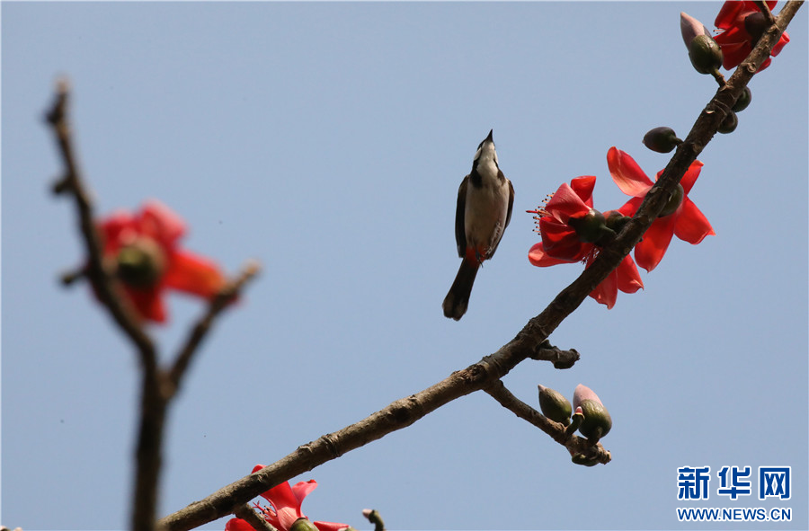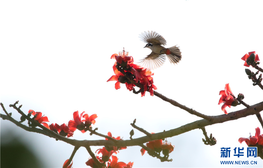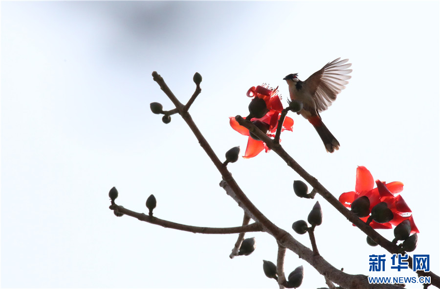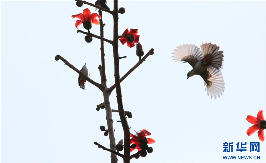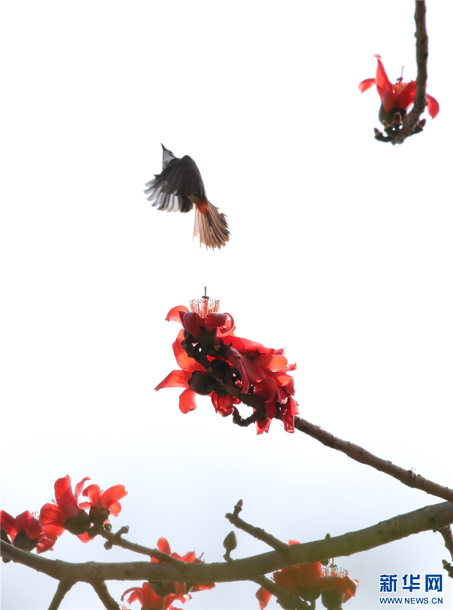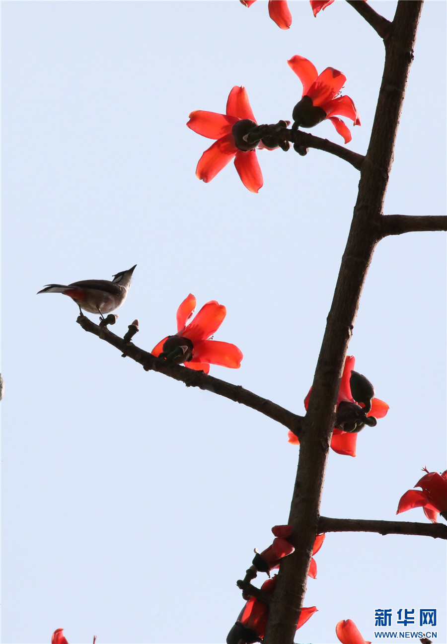 近日,在云南省西雙版納傣族自治州景洪市瀾滄江畔,木棉花爭相綻放,鳥兒在木棉枝頭嬉戲,一派生機盎然的景象。新華網發(李云生 攝)