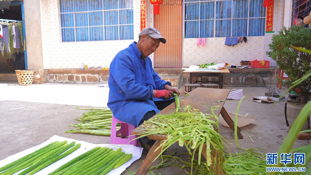 田園里,有的群眾忙著采收蒜苔,有的則揮舞著農具收割貢菜。在古底村委會永和村,家家戶戶忙著加工貢菜,削皮、開條、晾曬,院落里一排排鮮綠的長條徜徉在春光里。