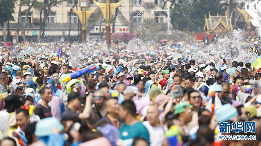 人們齊聚景洪市潑水廣場,互相潑水祝福,歡度潑水節(2023年4月15日攝)。新華網發(徐華陵 攝)