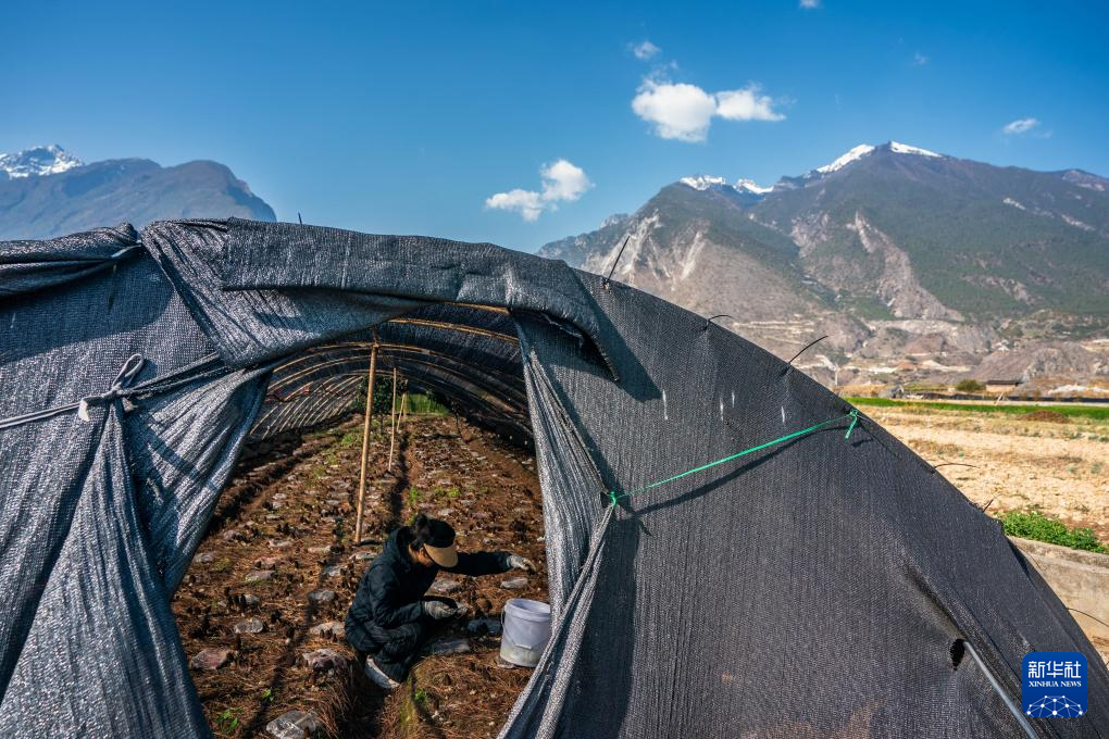 3月10日,在香格里拉市三壩納西族鄉江邊村,村民在大棚里采收羊肚菌。