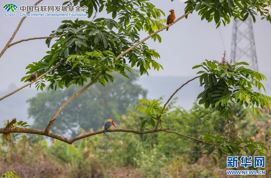 兩只鸛嘴翡翠同框 (4月2日攝)。新華網發(沙永勝 攝)