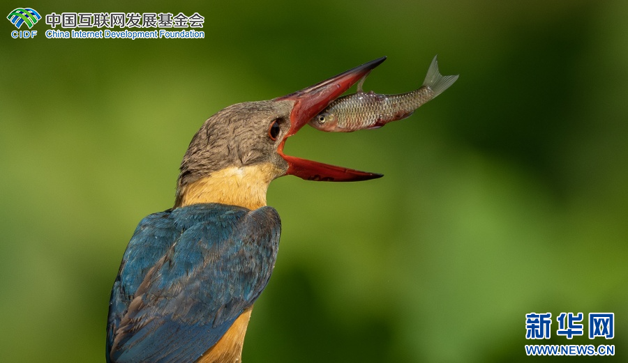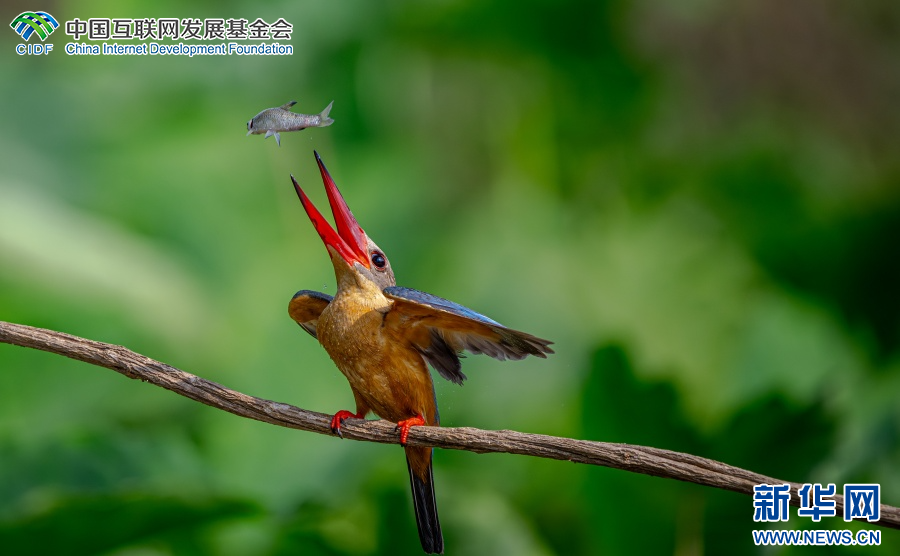 鸛嘴翡翠進食瞬間(3月30日攝)。新華網發(朱邊勇 攝)