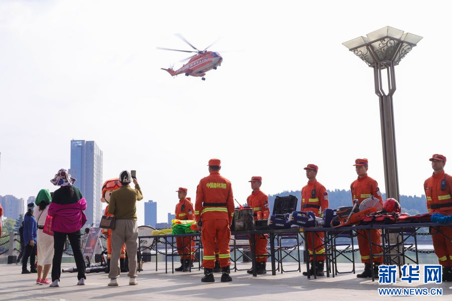 昆明航空救援支隊用直升機與地面隊員共同開展防火宣傳(4月4日攝)。新華網發(黎偉 攝)