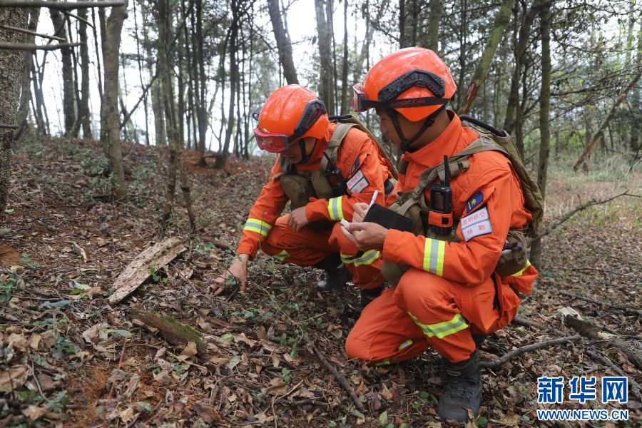 云南省森林消防總隊特勤大隊消防員登記腐殖層厚度(4月4日攝)。新華網發(李嘉仁 攝)