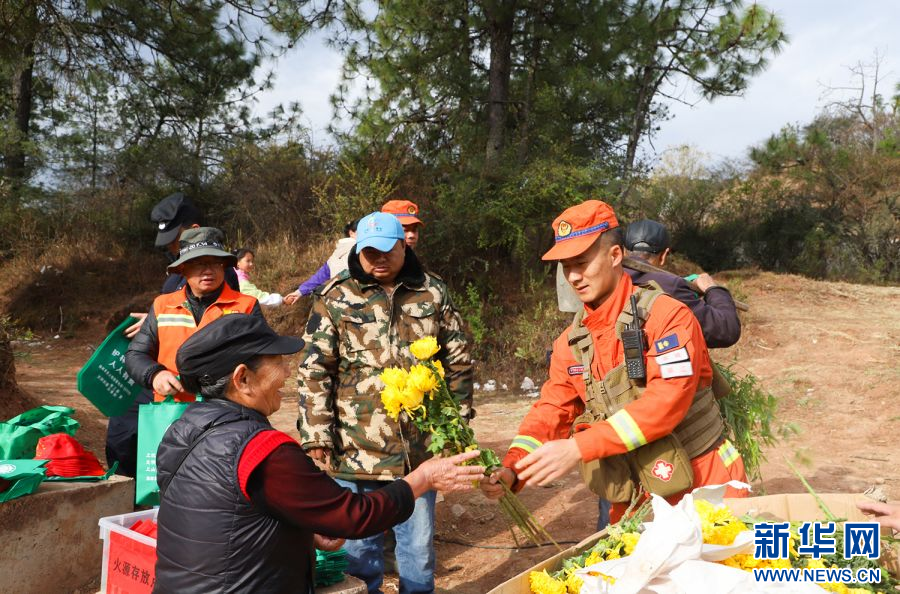 麗江市森林消防支隊消防員開展用鮮花換火種行動(4月4日攝)。新華網發(木曉東 攝)