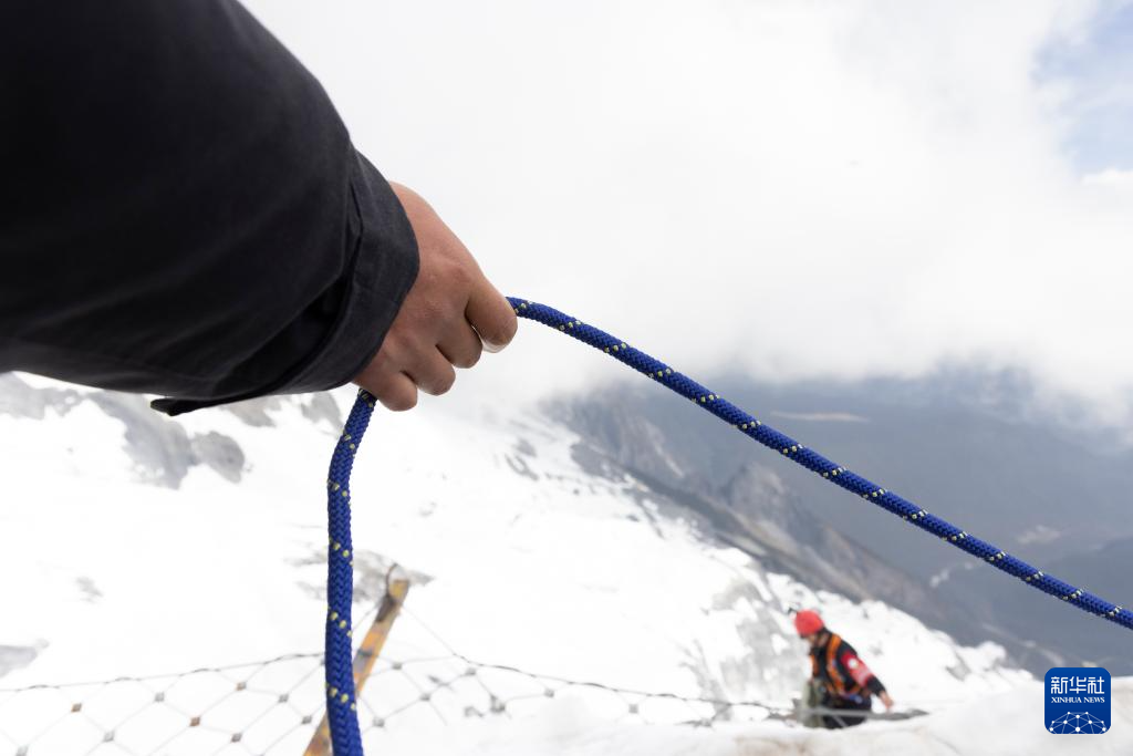 呂皓葳戴好墨鏡、鞋套,系上C字扣、八字環,在身后掛上一只垃圾袋,翻越欄桿,往平臺下的懸崖下降。同事在平臺上一邊緩緩釋放安全繩,一邊和他溝通,提示他哪里有垃圾……呂皓葳和同事們的工作是在玉龍雪山冰川公園清理掉落在懸崖峭壁的垃圾。他們通常兩到三人一組,克服高海拔缺氧、地形陡峭、天氣多變等不利因素,在隊友的協助下攀爬到山崖間進行垃圾清理工作,被稱為玉龍雪山景區的“蜘蛛人”。