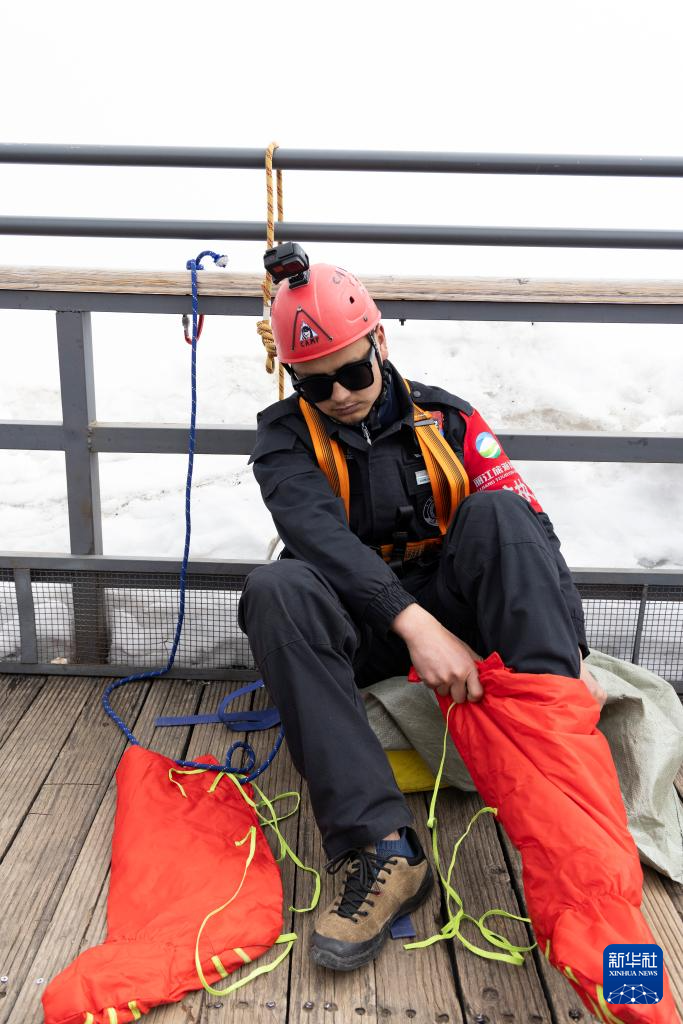 麗江玉龍旅游股份有限公司索道經營分公司景區部保安三組組員呂皓葳在下懸崖前穿鞋套(3月26日攝)。新華社記者 金立旺 攝