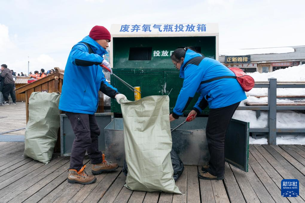 麗江玉龍旅游股份有限公司索道經營分公司景區部環衛三組組員和德軍(左)與同事和興蘭在清理廢棄氧氣瓶(3月26日攝)。新華社記者 陳欣波 攝