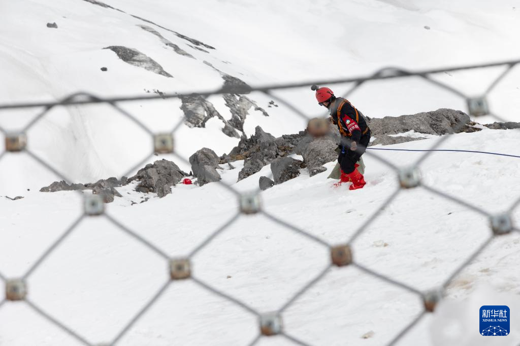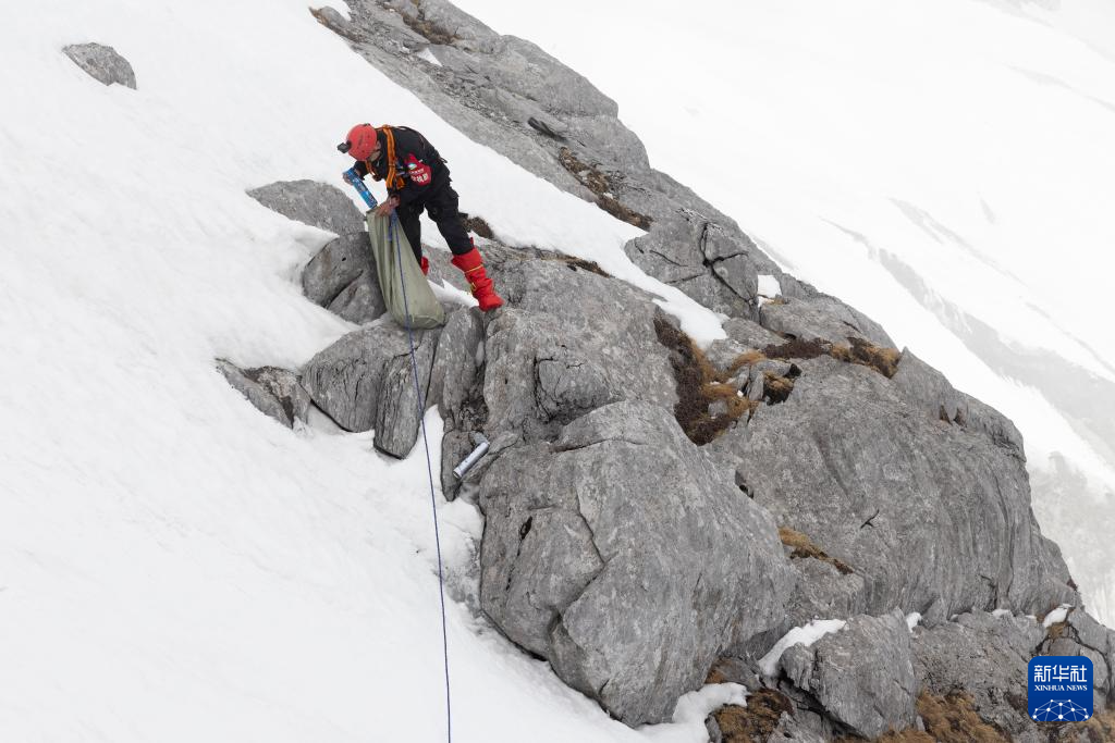 麗江玉龍旅游股份有限公司索道經營分公司景區部保安三組組員呂皓葳在玉龍雪山崖壁上撿拾氧氣瓶(3月26日攝)。新華社記者 金立旺 攝