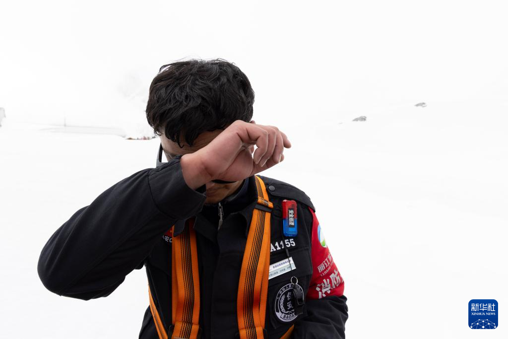 麗江玉龍旅游股份有限公司索道經營分公司景區部保安三組組員呂皓葳在結束崖壁上的垃圾清理工作后在平臺擦拭汗水(3月26日攝)。新華社記者 金立旺 攝