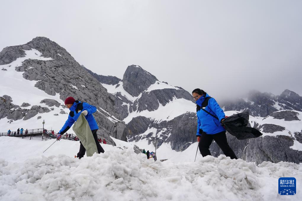 麗江玉龍旅游股份有限公司索道經營分公司景區部環衛三組組員和德軍與同事和興蘭在雪地上清理垃圾(3月26日攝)。新華社記者 陳欣波 攝