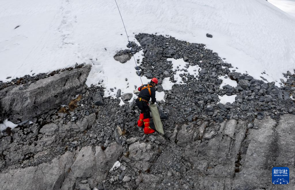 “蜘蛛人”負責清理掉落在懸崖峭壁的垃圾,環衛工和德軍和他的同事則負責景區的日常保潔。他們使用垃圾鉗、垃圾袋等工具收集雪地里的氧氣瓶等垃圾,打包后運到山下,以確保景區的干凈整潔。