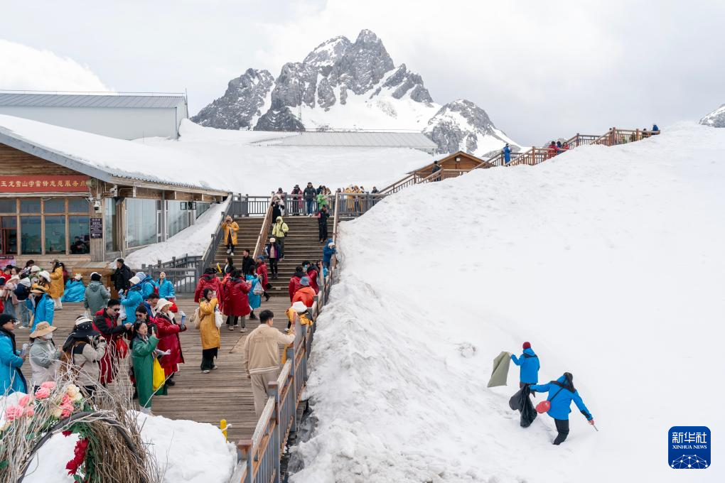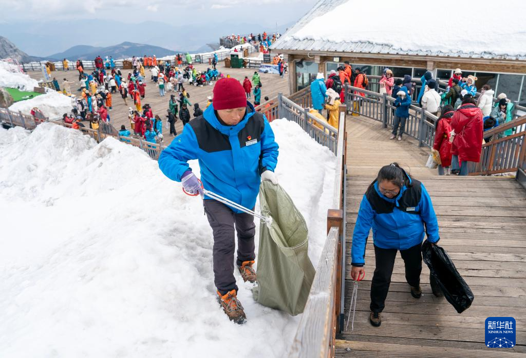 麗江玉龍旅游股份有限公司索道經營分公司景區部環衛三組組員和德軍(左)與同事和興蘭在清理游客棧道外雪地上的垃圾(3月26日攝)。新華社記者 金立旺 攝
