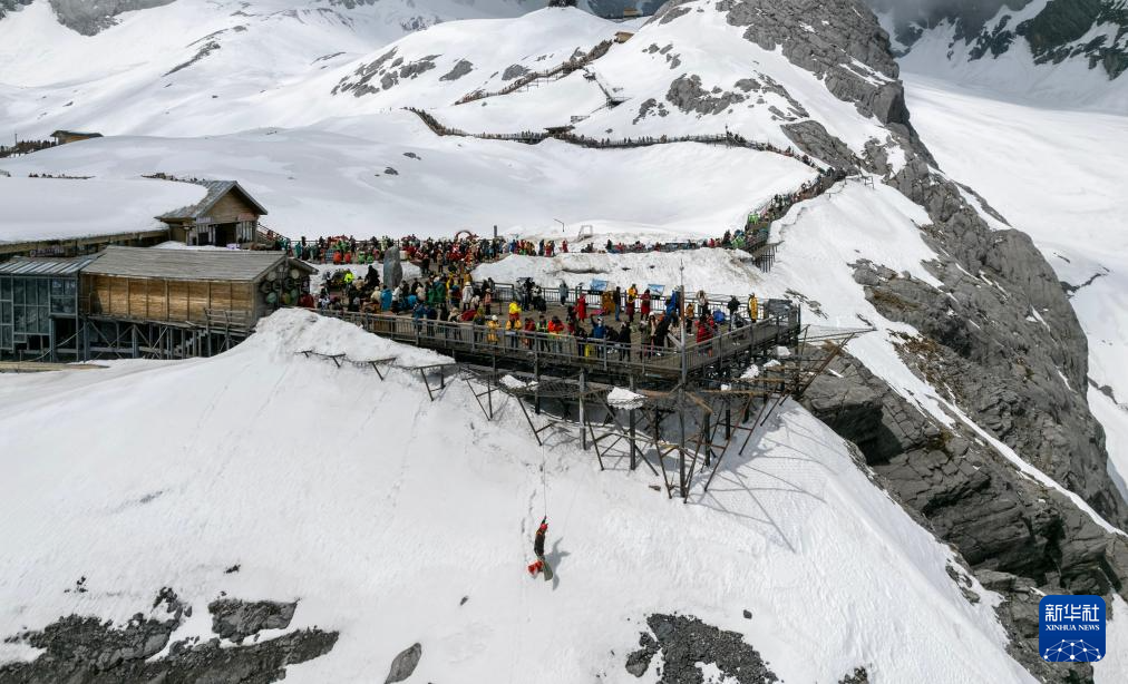 麗江玉龍旅游股份有限公司索道經營分公司景區部保安三組組員呂皓葳在玉龍雪山崖壁上清理垃圾(3月26日攝,無人機照片)。新華社記者 陳欣波 攝