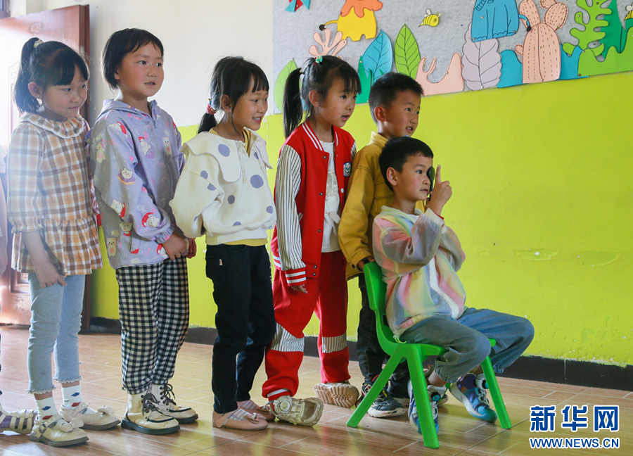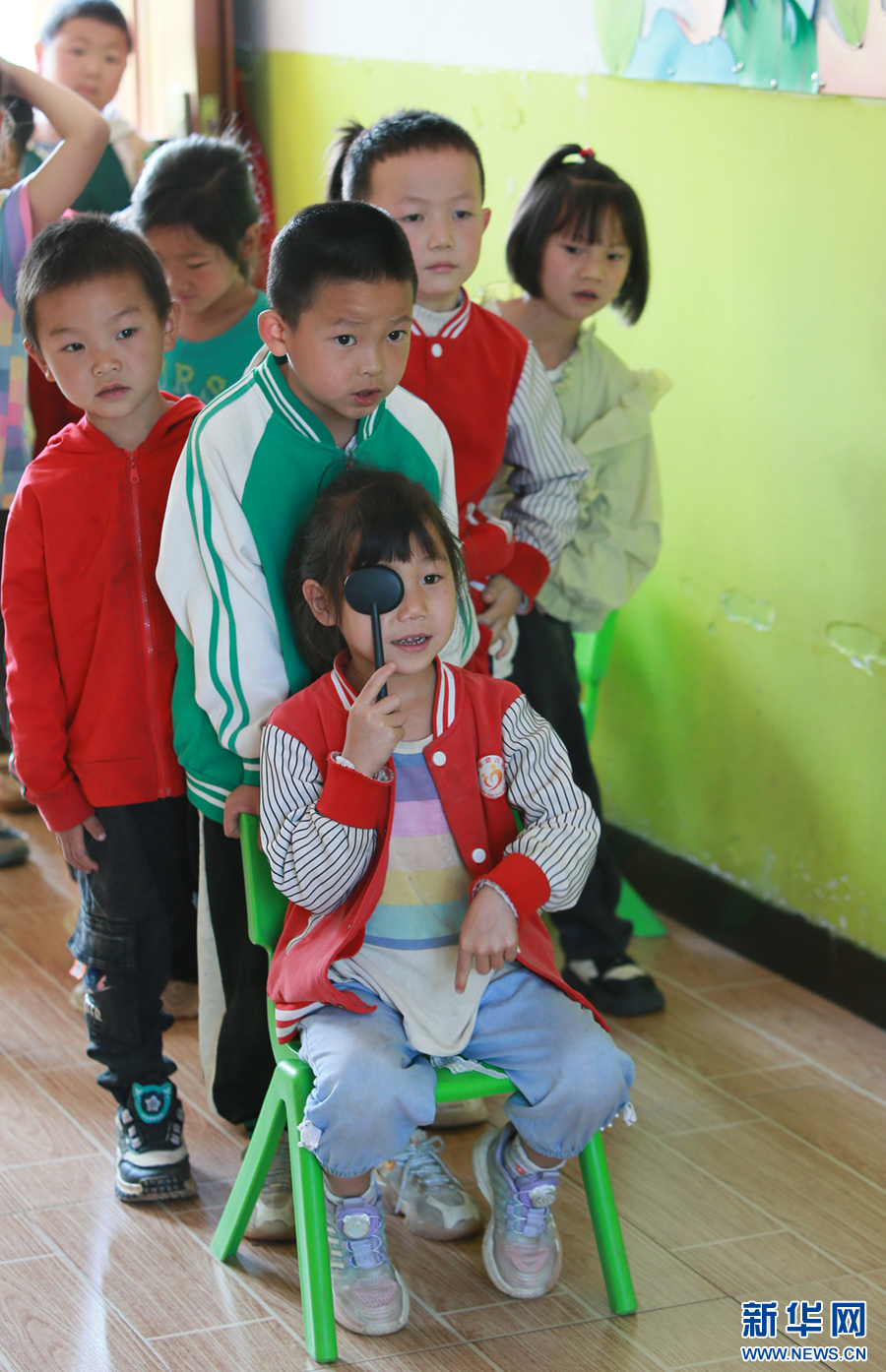 在云南省曲靖市沾益區花山街道啟明星幼兒園,小朋友正在進行視力測試(4月10日攝)。新華網發(楊俊鵬 攝)