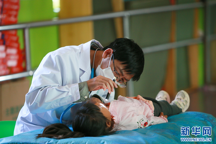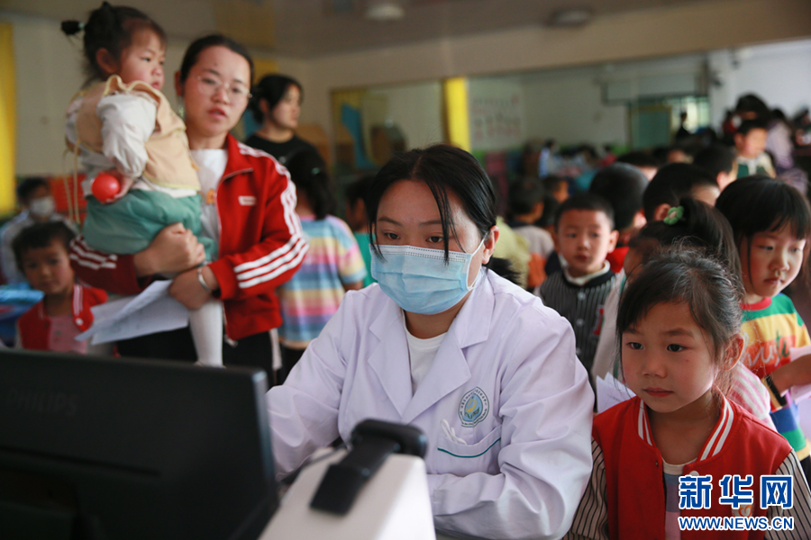 在云南省曲靖市沾益區花山街道啟明星幼兒園,醫護人員為小朋友檢查口腔(4月10日攝)。新華網發(楊俊鵬 攝)