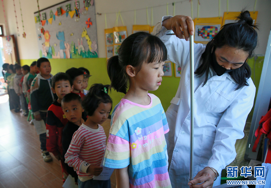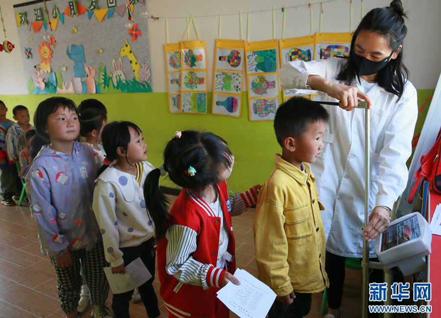 在云南省曲靖市沾益區花山街道啟明星幼兒園,醫護人員為小朋友測量身高體重(4月10日攝)。新華網發(楊俊鵬 攝)