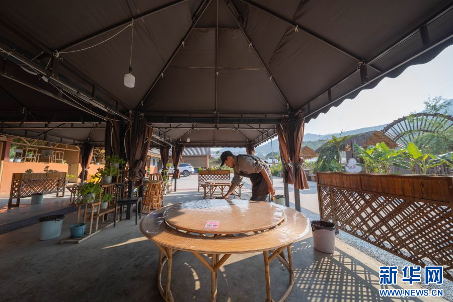 芒現村民小組“繁花河畔”餐廳內景(4月14日攝)。新華網 劉東 攝