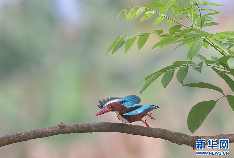 鸛嘴翡翠百發百中,叼魚急速起飛(4月15日攝)。新華網發(楊學飛 攝)