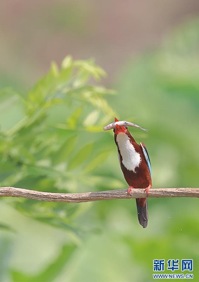 白胸翡翠玩耍小魚后吞食(4月15日攝)。新華網發(楊學飛 攝)
