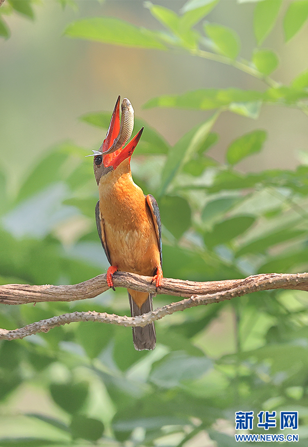 鸛嘴翡翠正在玩耍小魚(4月15日攝)。新華網發(楊學飛 攝)