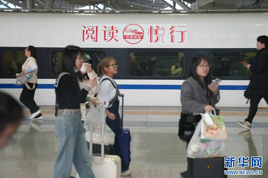 兩名旅客正在閱讀“書香列車”上提供的書籍(攝于4月23日)。新華網發(周濤 攝)