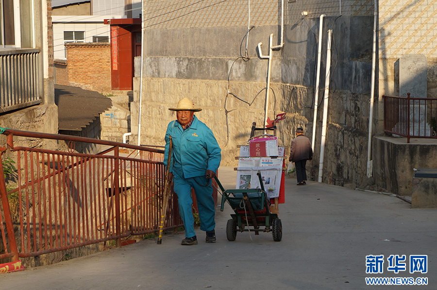 李存德拉著手推車前往農家書屋裝書(4月7日攝)。新華網 范芳鈺 攝