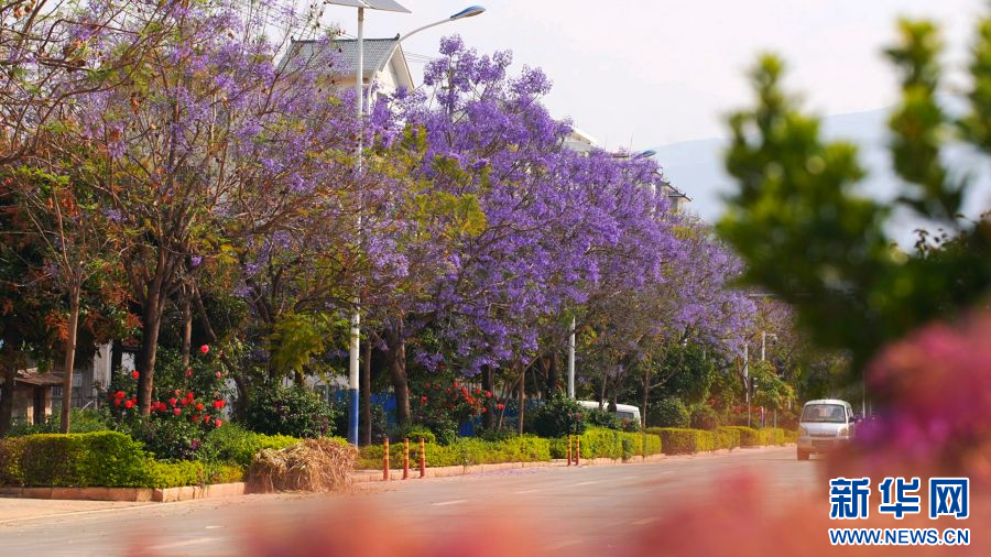 云南省大理州賓川縣,道路兩旁藍花楹盛開(4月3日攝)。新華網發(溫昌盛 攝)