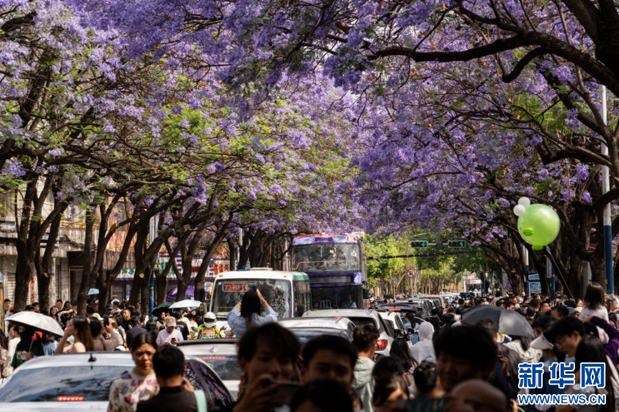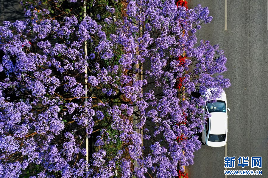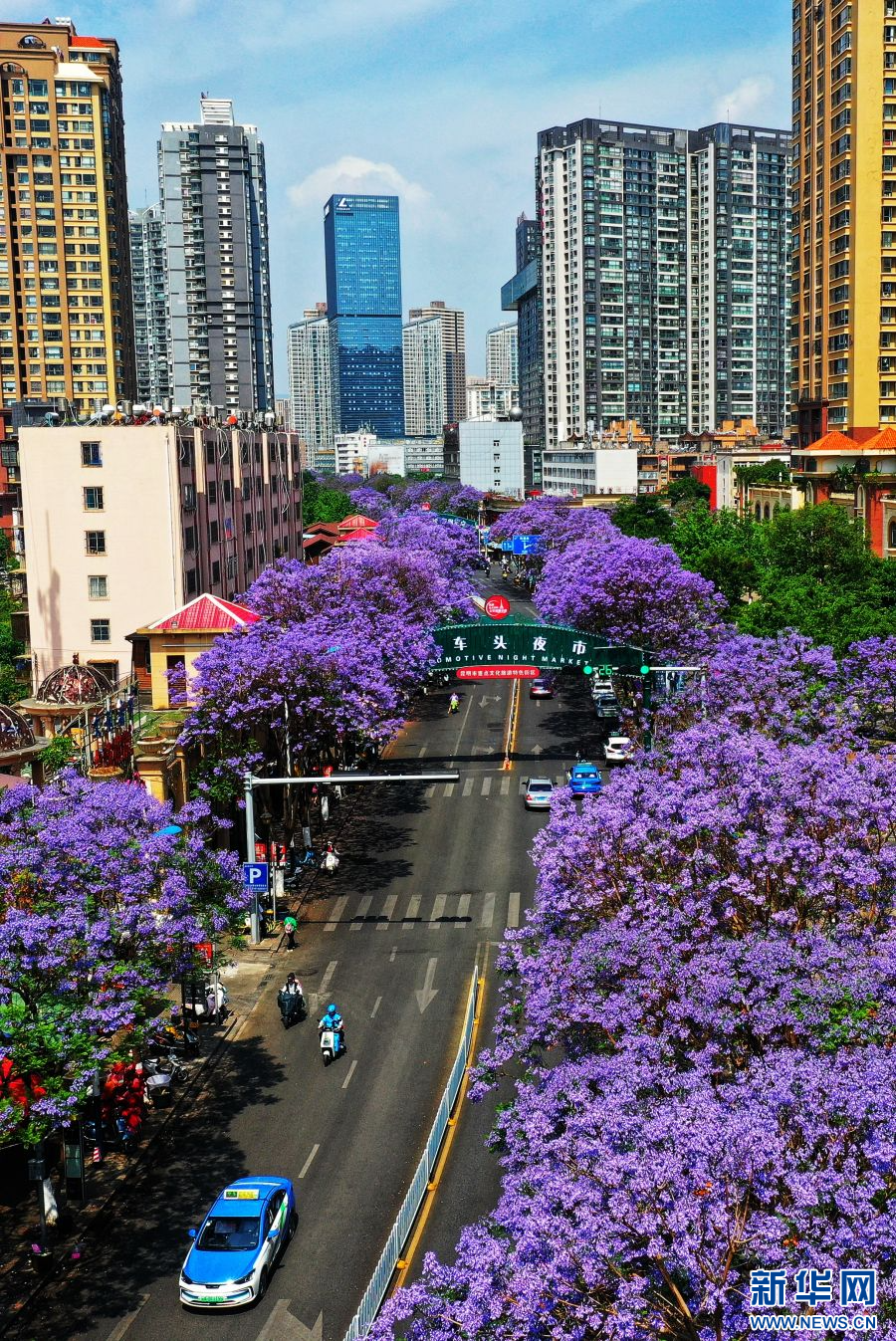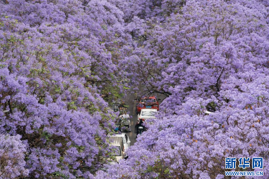 云南省昆明市北京路上,道路兩旁藍花楹盛開(4月21日攝)。新華網發(張麗 攝)