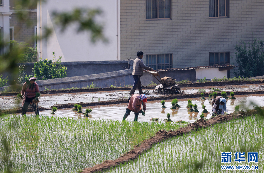 云南省曲靖市沾益區天生壩村,村民在田里栽插勞作(4月28日攝)。新華網發(孫文來 攝)