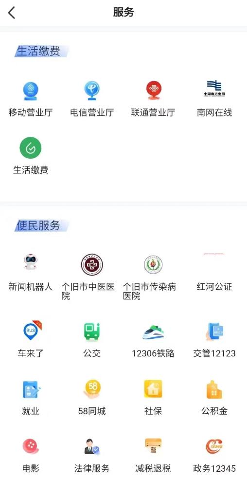“云南紅河發布”客戶端“服務”版塊頁面。
