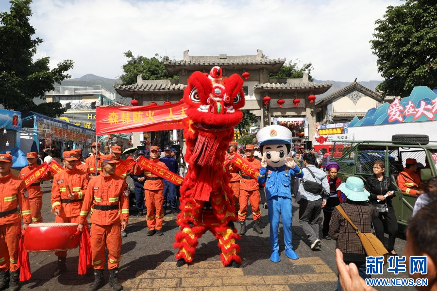 指戰員在大理三月街開展防火宣傳 (5月2日攝)。新華網發(陳勝瑤 攝)