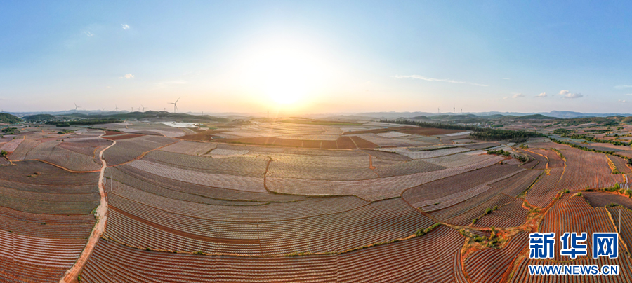 近日,位于滇東高原的云南省曲靖市沾益區的農田里,紅土地上開出成行的壟,阡陌縱橫,如同寫在大地上的道道詩行??罩续B瞰,紅土地與村莊、山巒、風車、夕陽等相應成景,構成了一幅美麗的田園畫卷。新華網發(楊俊鵬 攝)
