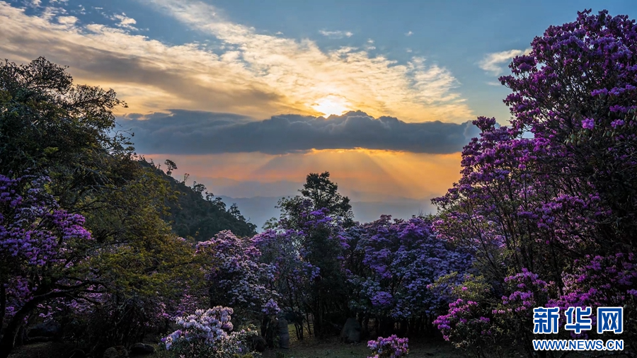 近日,云南省大理白族自治州洱源縣馬耳山的高山杜鵑競相綻放,在攝影師的鏡頭里,簇簇繁花順著山勢鋪展開來,連綿數公里,景色醉人。特別是清晨和日暮,盛放的杜鵑花與朝霞、晚星“同框”,日升云動、斗轉星移間,高山杜鵑的美多了一份壯闊與詩意,令人心馳神往。(羅新才 攝影報道)