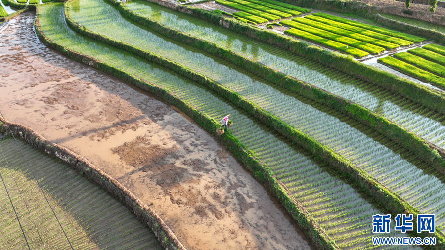 初夏時節,在云南省曲靖市沾益區天生壩村雨后的田野里,農民搶抓農時,忙著栽插秧苗,整理稻田。勞作的身影與阡陌農田、翠綠的秧苗、遠處的村莊,共同構成一幅美麗的鄉村田園畫卷。新華網發(孫文來 攝)