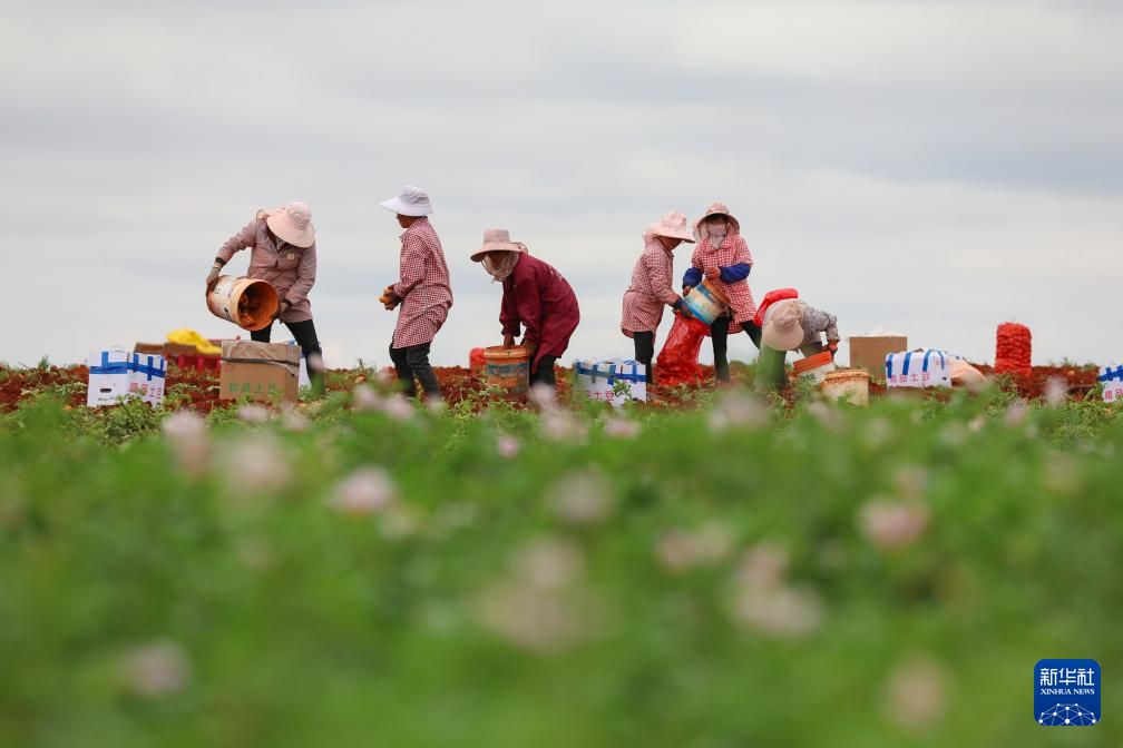 5月15日,在陸良縣小百戶鎮普樂村委會高效農業示范基地,農民在采收小春馬鈴薯。