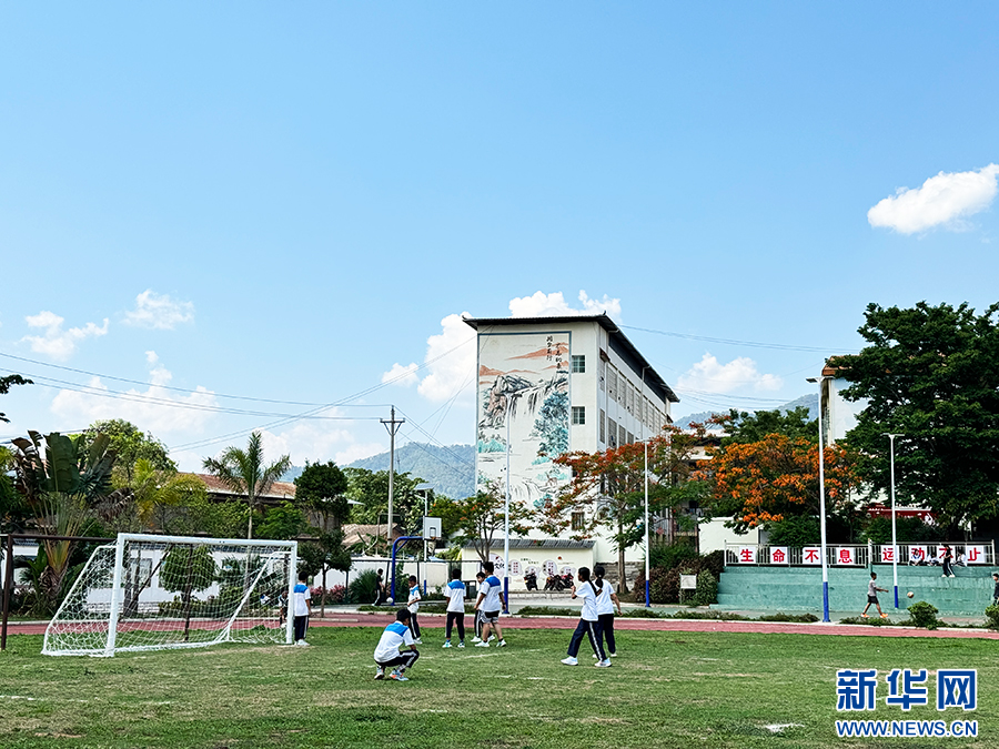磨憨中學學生正在踢足球(5月15日攝)。新華網發(李娜 攝)