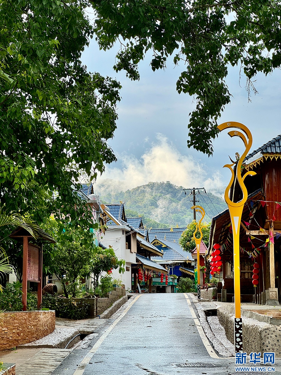 干凈嶄新的柏油路、設有近百個停車位的潑水廣場、深藍琉璃瓦片搭配傣家吊腳樓、枝繁葉茂的百年古菩提樹……雨過天晴,遠山的薄霧漸漸散開,通過精致美觀的寨門后便進入磨憨鎮尚岡村,眼前的美麗村貌驚艷著每一位來訪者。