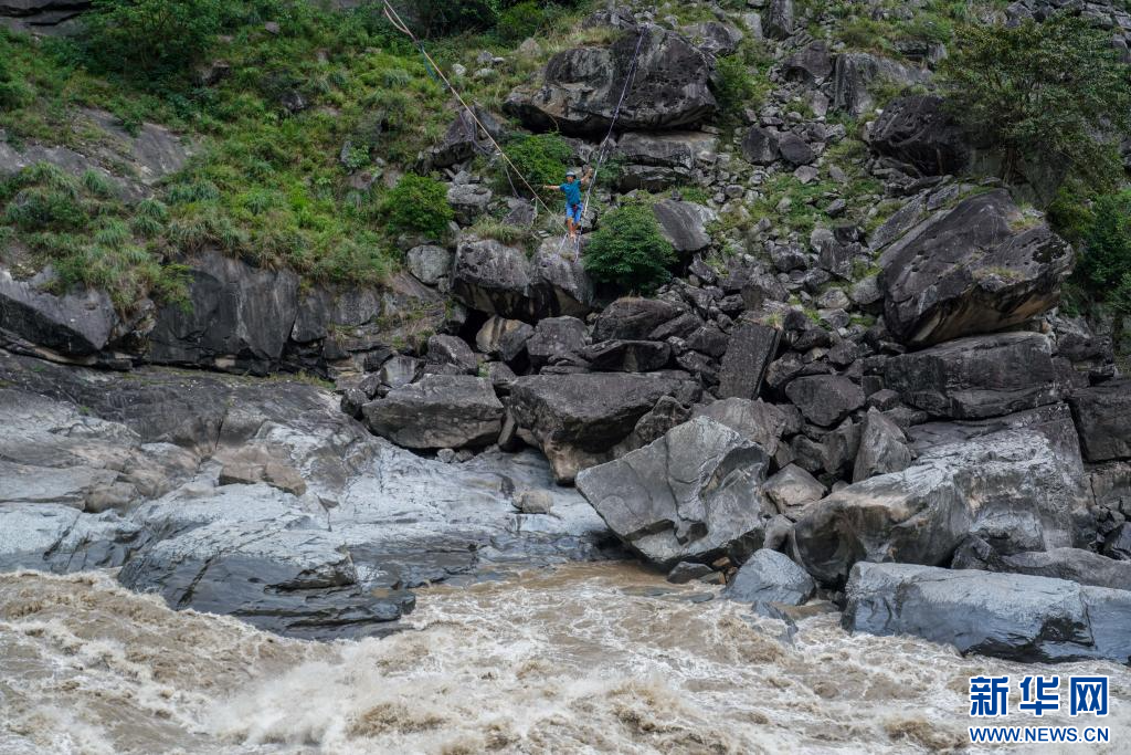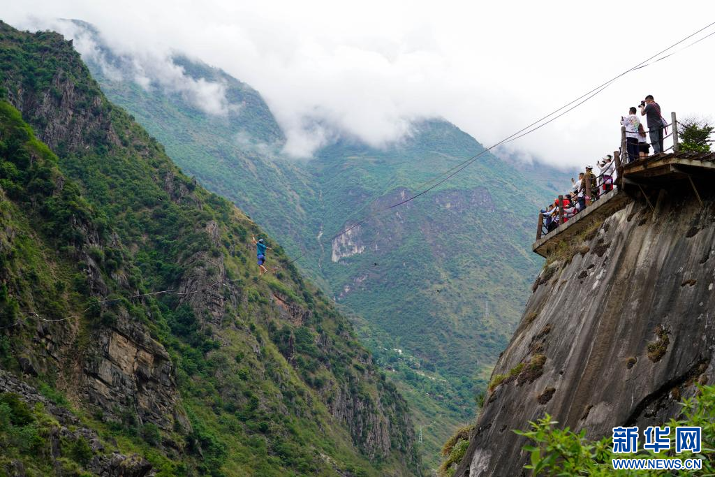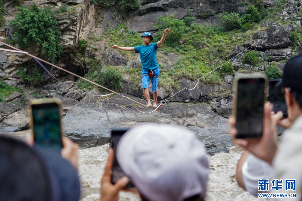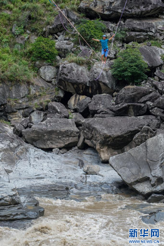 5月26日,在怒江大峽谷“老虎跳”險灘,張亮為觀眾帶來高空扁帶表演。新華社記者 王靜頤 攝