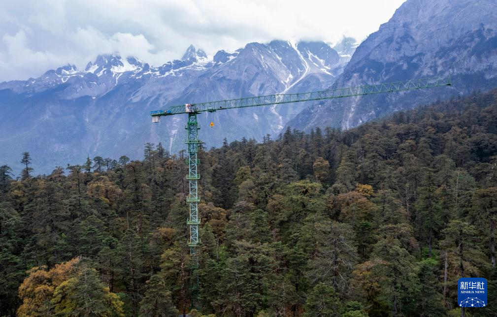 2024年5月24日拍攝的云南麗江森林生物多樣性國家野外科學觀測研究站云杉坪大樣地森林林冠塔吊(無人機照片)。新華社記者 陳欣波 攝