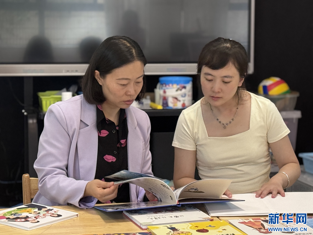 王開瑩(左)與蘇昕迪(右)討論繪本存在的問題(5月29日攝)。新華網發(柴靜 攝)