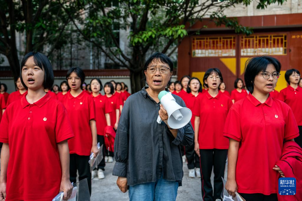 6月7日,張桂梅帶領學生齊唱歌曲《萬疆》,為高三學生送考。