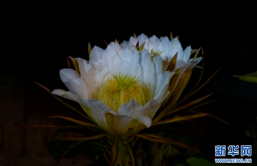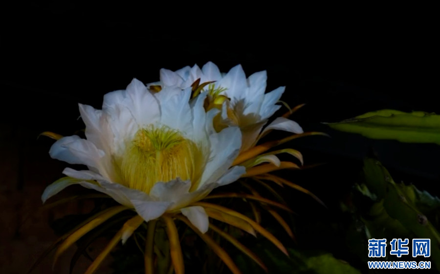 近日,云南省德宏傣族景頗族自治州瑞麗市的攝影愛好者,用延時攝影記錄下火龍果花盛開的瞬間。與火龍果果實熱烈的顏色不同,火龍果花的花瓣潔白剔透,花蕊淡黃,在月光下顯得嫻靜淡雅。
