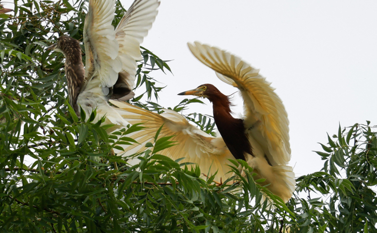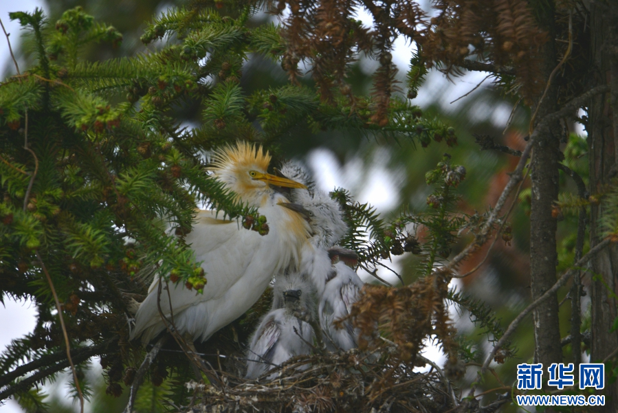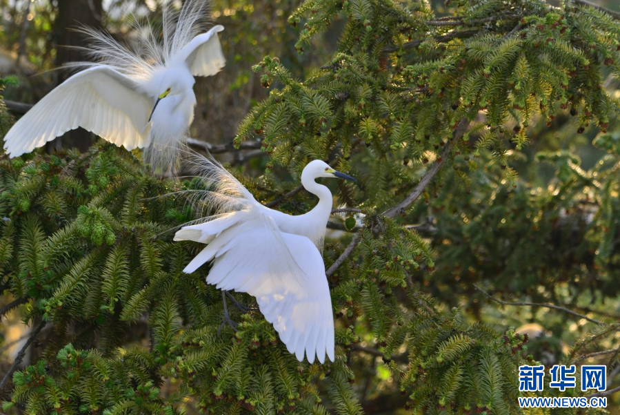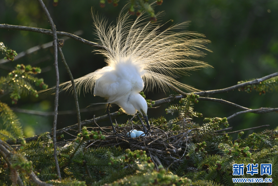 白鷺銜樹枝筑巢(6月11日攝)。新華網發(昌寧縣融媒體中心供圖)