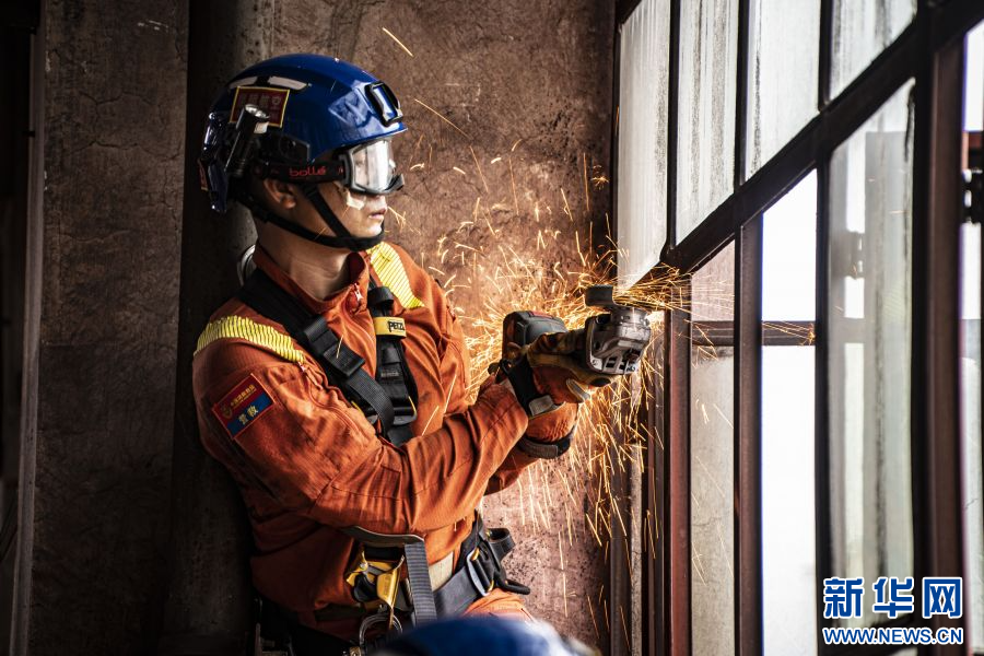 救援人員利用切割機打開救援通道,進行斜向救援(6月18日攝)。新華網發(駱銀文 攝)