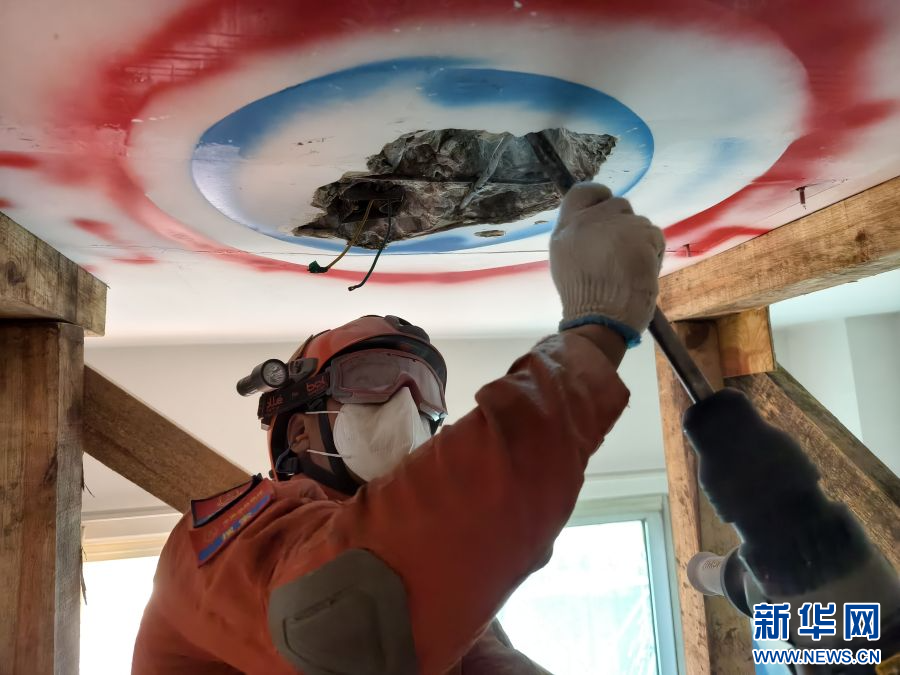 消防救援人員共同破開墻壁(6月18日攝)。新華網發(郭俊 攝)