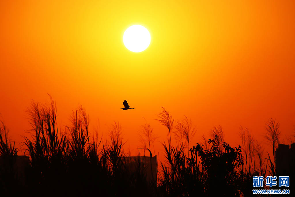 朝陽下,蒼鷺振翅高飛(6月11日攝)。新華網發(趙樹龍 攝)