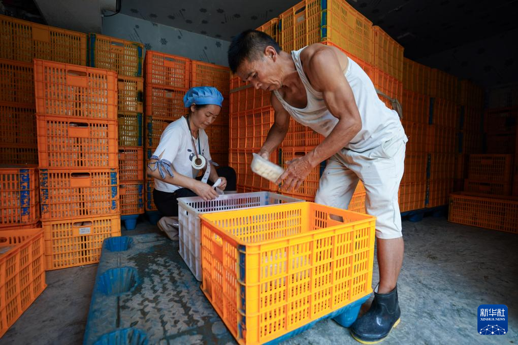 在云南省文山壯族苗族自治州西疇縣蚌谷鄉龍正村,兩名工人在劉禹丹的豆腐加工廠工作(2023年7月27日攝)。新華社記者 陳欣波 攝