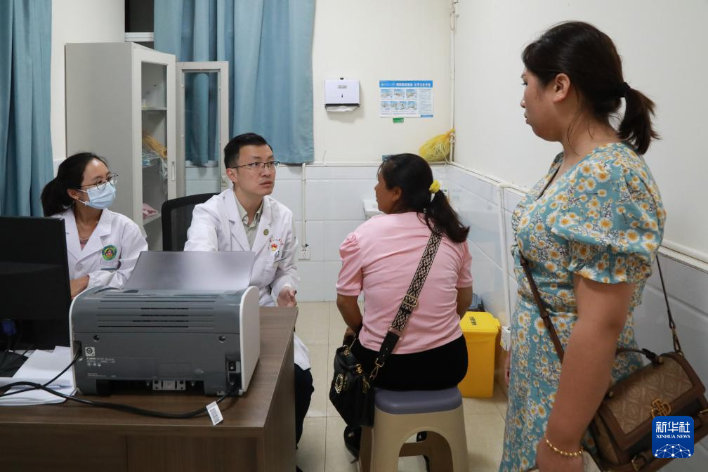 上海第九人民醫院援滇醫療隊隊長劉菲(左二)在云南省普洱市瀾滄縣第一人民醫院診室內接診(2024年7月3日攝)。新華社發(潘華杰 攝)